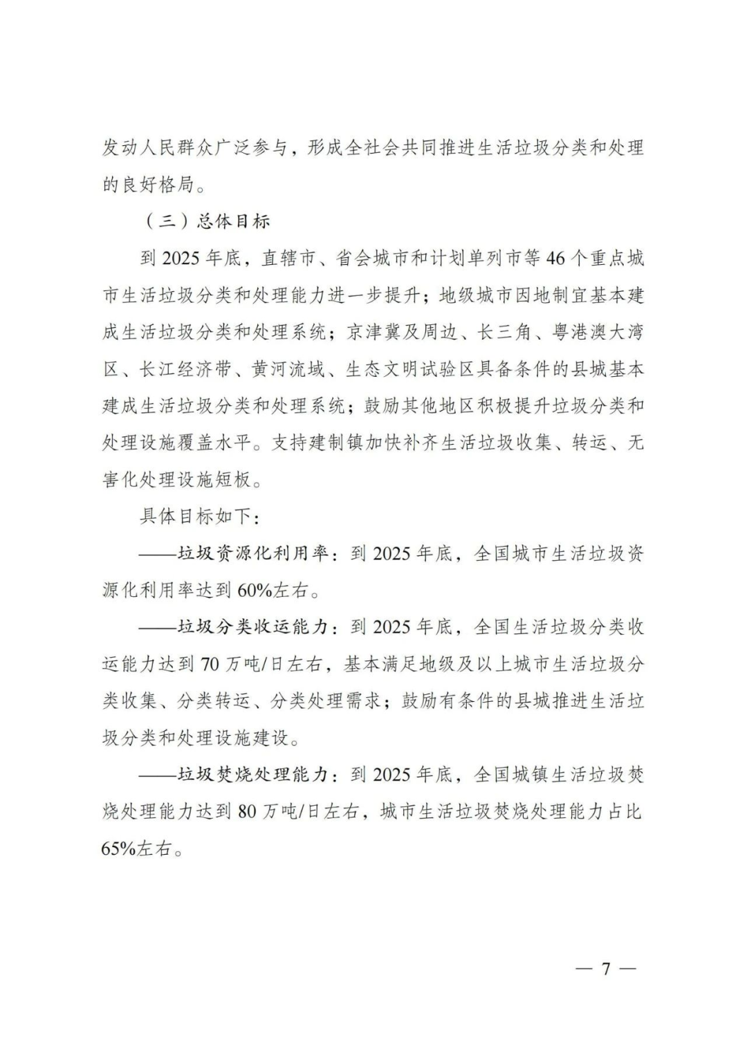 到2025年底,直轄市、省會(huì)城市和計(jì)劃單列市等46個(gè)重點(diǎn)城市生活垃圾分類和處理能力進(jìn)一步提升;地級(jí)城市因地制宜基本建成生活垃圾分類和處理系統(tǒng);京津冀及周邊、長(zhǎng)三角、粵港澳大灣區(qū)、長(zhǎng)江經(jīng)濟(jì)帶、黃河流域、生態(tài)文明試驗(yàn)區(qū)具備條件的縣城基本建成生活垃圾分類和處理系統(tǒng);鼓勵(lì)其他地區(qū)積極提升垃圾分類和處理設(shè)施覆蓋水平。支持建制鎮(zhèn)加快補(bǔ)齊生活垃圾收集、轉(zhuǎn)運(yùn)、無(wú)害化處理設(shè)施短板。