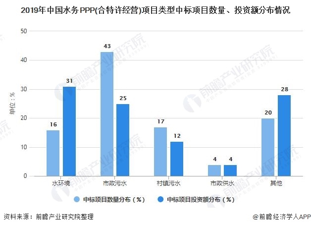 2019年,水務(wù)PPP(合特許經(jīng)營)中標項目數(shù)量超過400個,投資額近3000億。從項目數(shù)量分布上看,市政污水處理特許經(jīng)營占主要部分,占比43%;從項目金額分布上看,水環(huán)境PPP占比最大,占比31%。