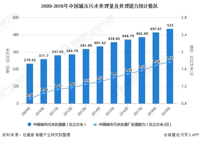 污水處理是目前水務(wù)行業(yè)重點關(guān)注的領(lǐng)域之一。由于城鎮(zhèn)化和經(jīng)濟發(fā)展需求,中國城市近年來污水產(chǎn)生量和處理量呈上升趨勢。從城市污水處理情況來看,截至2019年底,全國城市污水處理廠處理能力1.77億立方米/日,累計處理污水量523億立方米;全國地級及以上城市建成區(qū)排查出黑臭水體2899個,其中2513個經(jīng)過處理已消除黑臭現(xiàn)象,消除比例達86.7%。