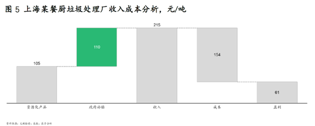由于沼氣、粗油脂等資源化產(chǎn)物產(chǎn)量少、應(yīng)用有限,在當(dāng)前技術(shù)工藝下,餐廚垃圾處理的資源化價(jià)值很難獲得規(guī)模性與經(jīng)濟(jì)性,商業(yè)模式尚未完全走順暢。目前我國(guó)政府對(duì)餐廚垃圾企業(yè)實(shí)行運(yùn)行補(bǔ)貼和收運(yùn)補(bǔ)貼,具體金額大小受技術(shù)、地區(qū)、試點(diǎn)發(fā)展過程、項(xiàng)目處理量等因素影響。調(diào)研發(fā)現(xiàn),由于資源化產(chǎn)品盈利有限,難以覆蓋全部成本,餐廚垃圾處理企業(yè)的盈利當(dāng)前主要依靠政府補(bǔ)貼(見圖5)。
