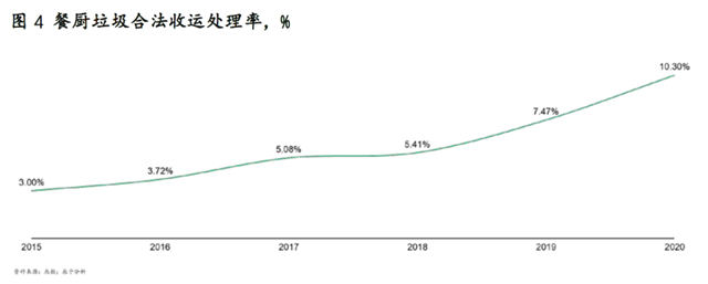 由于以上原因,我國(guó)餐廚垃圾回收并不完全。據(jù)統(tǒng)計(jì),盡管餐廚垃圾合法收運(yùn)處理率近5年持續(xù)上升,但目前也僅為10%左右(見圖4)。