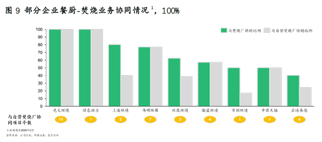 在垃圾分類全面推行的大背景下,這些大型固廢企業(yè)正利用協(xié)同優(yōu)勢(shì)降維打擊(見圖9)。一方面,垃圾焚燒主業(yè)帶給這些企業(yè)資金和政府資源雙重優(yōu)勢(shì);另一方面,協(xié)同處置帶來(lái)降本增效,可以幫助這些企業(yè)降低財(cái)務(wù)壓力:在收入端,協(xié)同優(yōu)勢(shì)在于餐廚沼渣余電上網(wǎng);而在成本端,除可節(jié)約土建、人工等成本外,干濕垃圾處置的發(fā)電設(shè)備、除臭系統(tǒng)、滲濾液處理系統(tǒng)、蒸汽供熱系統(tǒng)等也可共用,從而降低折舊攤銷成本。