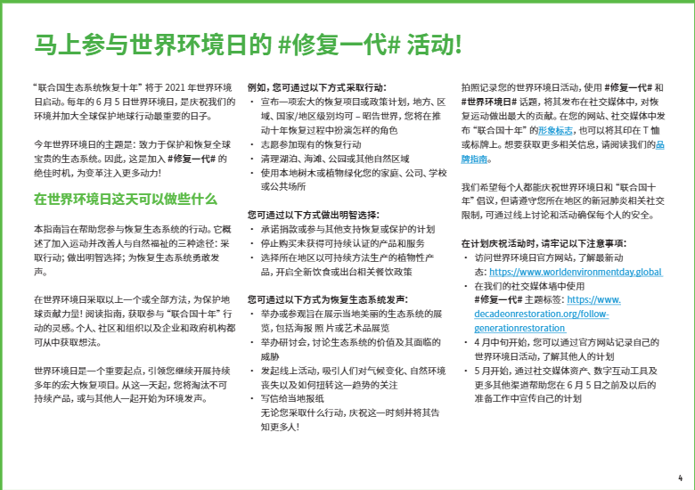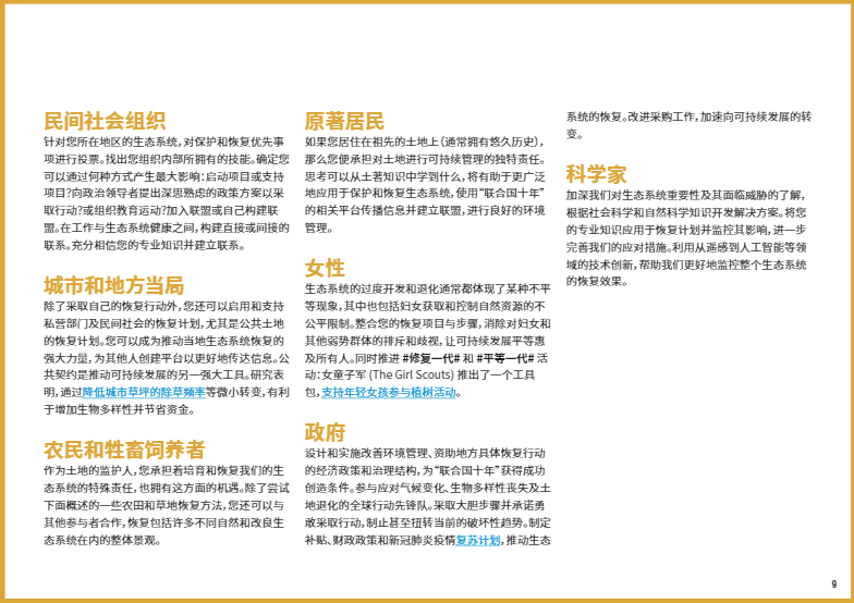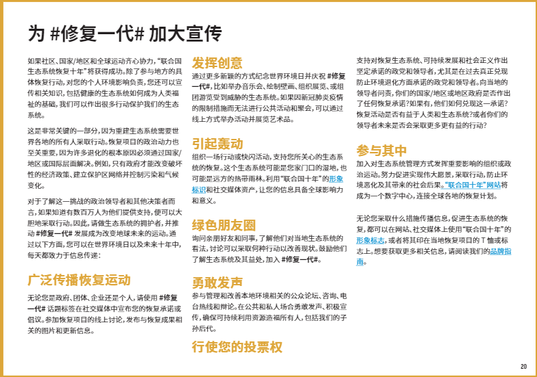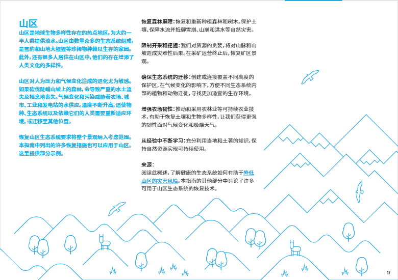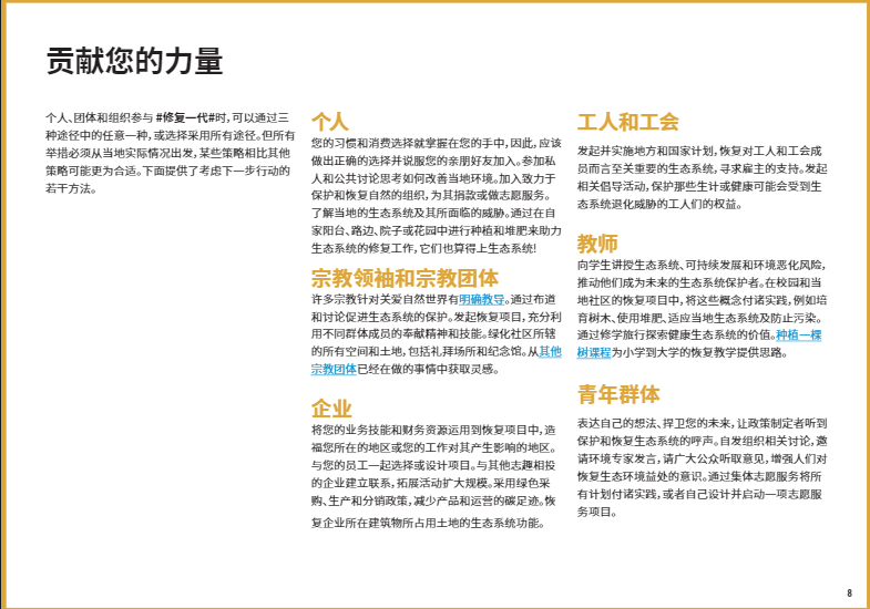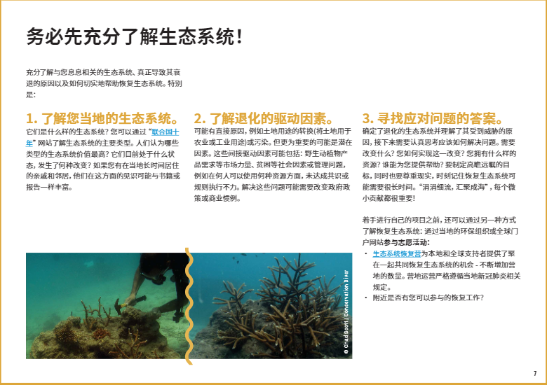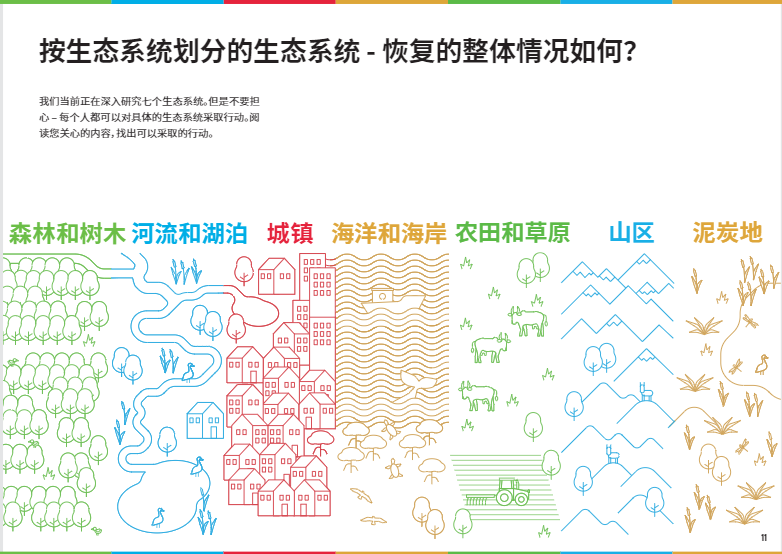 在本文中,我們將重點介紹八個關鍵的生態(tài)系統(tǒng)類型,以及如何開展修復工作使它們恢復活力。如果你有志于加入#修復一代,#RestorationGeneration,想深入了解改善本地生態(tài)系統(tǒng)的方法,歡迎大家下載閱讀由”聯(lián)合國十年”倡議發(fā)布的《生態(tài)系統(tǒng)修復手冊》,一本有關治愈地球的實用指南??