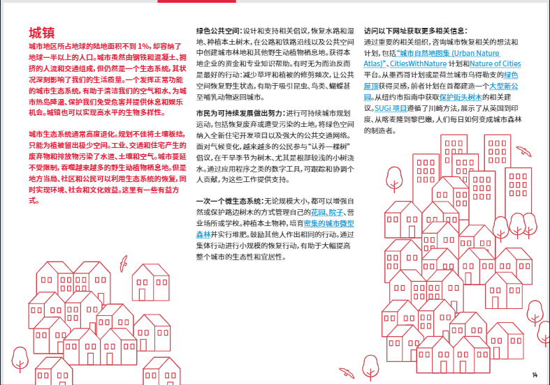 城鎮(zhèn)看起來就像是生態(tài)沙漠。房屋、道路和工廠之間幾乎沒有植被生長的空間。廢棄物和污染破壞水道、土壤和空氣。但是城市具有巨大的恢復潛力。公民團體和市政當局可以清理水道;種植吸引蜜蜂的植物;并在公園、學校和其他公共場所創(chuàng)造城市林地和其他野生動植物棲息地。減少割草的頻率不僅能節(jié)約城市的開支,并且可以使自然蓬勃發(fā)展。透水性人行道以及城市濕地可防止洪水和污染。改造受污染的工業(yè)區(qū),使之變身成為自然和娛樂場所。你知道嗎? 如今在紐約的中央公園,載有記錄的鳥類高達280多種。在聯(lián)合國環(huán)境規(guī)劃署和聯(lián)合國糧食及農(nóng)業(yè)組織的領導下,“聯(lián)合國生態(tài)系統(tǒng)恢復十年”倡議將匯集全球的政治支持、科學研究和財政力量,開展大規(guī)模的生態(tài)修復工作,致力于恢復數(shù)百萬公頃的陸地和水生生態(tài)系統(tǒng)。