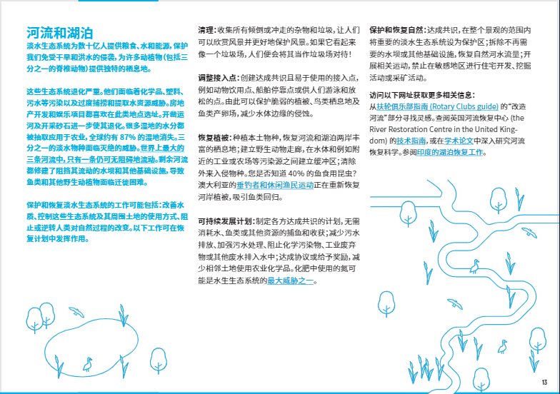 安全且充足的水源已成為一種奢侈品。污染、過度捕撈、基礎設施建設以及因灌溉、工業(yè)和家庭用水增加而對水資源無休止的攫取正導致淡水生態(tài)系統(tǒng)不斷退化?;謴鸵馕吨鴾p輕污染、減少并有效處理廢棄物、對水源和魚類資源的開采進行可持續(xù)管理以及恢復地表和地下的植被。