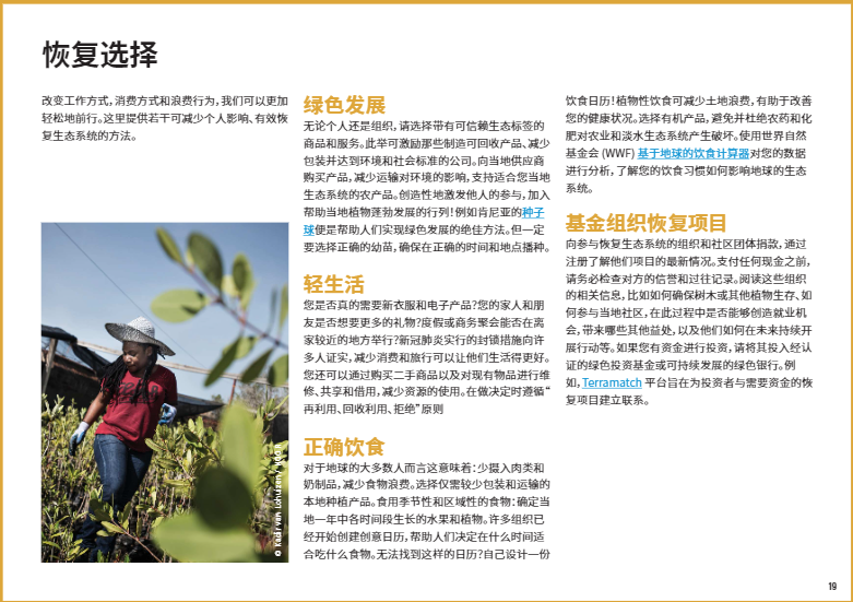 人們砍伐并清空森林和樹木,將林地轉(zhuǎn)化為耕地、牧場、城市等用地以滿足人類對土地和資源的渴求。伐木、劈柴、污染、有害物種入侵和野火正在摧毀所剩不多的林地?;謴蜕稚鷳B(tài)系統(tǒng)意味著大規(guī)模植樹造林并減輕森林的壓力,使樹木恢復自然生長。糧食系統(tǒng)是森林流失的一大主要驅(qū)動因素。重新考慮我們?nèi)绾畏N植及消費糧食,有助于減輕森林與日俱增的壓力。因土壤的退化而遭廢棄的農(nóng)田可能是恢復森林的理想之地,這也意味著繁忙的農(nóng)場和村莊周邊蘊藏著培育成片森林和林地的機會。