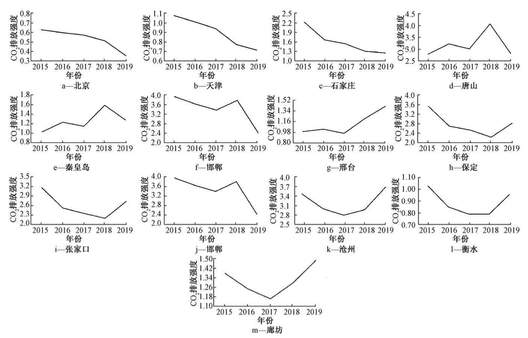 圖2為京津冀城市群CO2排放強度特征及變化趨勢??梢灾庇^地看出:中國CO2排放強度地區(qū)分布呈現(xiàn)顯著的非均衡特征,北京市的CO2排放強度最低,近5年碳排放強度為0.36~0.64 t/萬元GDP。其次是天津市和衡水市,其排放強度較小,但仍是北京市碳排放強度的1倍左右,為0.71~1.07 t/萬元GDP。廊坊、邢臺和秦皇島的CO2排放強度居中游水平,近5年碳排放強度為0.96~1.59 t/萬元GDP。唐山、保定、邯鄲、滄州和張家口的CO2排放較高,碳排放強度為2.19~4.07 t/萬元GDP,特別是2018年的唐山市,CO2排放強度最高,達到4.07 t/萬元GDP。