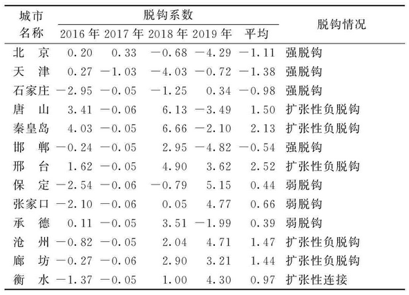 首先分別計算2015—2019年的脫鉤系數(shù),取這些年間脫鉤系數(shù)的平均值作為該城市的脫鉤情況,結果見表2。可知:北京、天津、石家莊和邯鄲經(jīng)濟增長與碳排放呈強脫鉤狀態(tài),表明這4個城市經(jīng)濟發(fā)展與碳排放量反向變動,即經(jīng)濟不斷增長,但碳排放量卻逐漸減少;保定、張家口和承德經(jīng)濟增長與碳排放呈弱脫鉤狀態(tài),表明該3個城市經(jīng)濟發(fā)展的增長速度大于碳排放的增長速度;唐山、秦皇島、邢臺、滄州和廊坊經(jīng)濟增長與碳排放呈現(xiàn)擴張性負脫鉤狀態(tài),表明這5個城市的經(jīng)濟增長速度小于碳排放的增長速度;只有衡水市的經(jīng)濟增長與碳排放呈擴張性連接狀態(tài),表明該城市經(jīng)濟增長速度同比正增長。表2 京津冀城市群經(jīng)濟增長與碳排放脫鉤結果