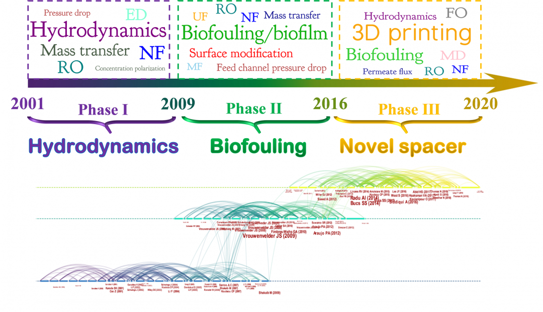 圖3 對(duì)過去20年所有以“ feed spacer”和“ membrane”為主題的文獻(xiàn)中的關(guān)鍵詞進(jìn)行聚類分析和詞頻統(tǒng)計(jì)。所有文獻(xiàn)可以聚類成三類,并且呈現(xiàn)較為明顯的分階段發(fā)展特征,三個(gè)階段對(duì)應(yīng)的關(guān)鍵詞分別為“流體力學(xué)”、“生物污染/生物膜”和“3D打印”。表明研究重點(diǎn)從第一階段(2001——2008年)的流體動(dòng)力學(xué),過渡到第二階段(2009——2015年)的生物污染,再到第三階段(2016——2020年)的新型隔網(wǎng)設(shè)計(jì)與優(yōu)化。