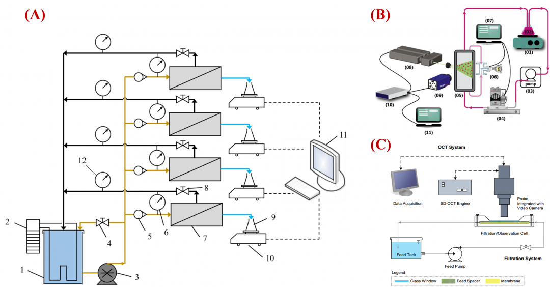 本文首先總結(jié)了該領(lǐng)域常用的研究方法,包括水力學(xué)實(shí)驗(yàn)、膜污染實(shí)驗(yàn)和計(jì)算流體力學(xué)(CFD)模擬。水力學(xué)實(shí)驗(yàn)和膜污染實(shí)驗(yàn)主要采用錯(cuò)流過濾裝置(圖4A),且保證進(jìn)水隔網(wǎng)與膜面緊貼,以更好地模擬流體在卷式膜組件中的行為。流道壓降差(FCP drop)是衡量進(jìn)水隔網(wǎng)性能的重要參數(shù),也是水力學(xué)實(shí)驗(yàn)主要的測(cè)試指標(biāo)之一,對(duì)其的測(cè)量也從最初的U型管到如今的高精度壓差傳感器。膜污染實(shí)驗(yàn)主要指生物污染實(shí)驗(yàn),近些年研究者們開始更多關(guān)注流道內(nèi)生物污染的動(dòng)態(tài)發(fā)展過程,這得益于實(shí)時(shí)原位觀測(cè)技術(shù)的發(fā)展,如PIV(圖4B)、OCT(圖4C)、NMR等,其中NMR已可以被運(yùn)用于工業(yè)級(jí)別的卷式膜組件中流態(tài)和膜污染的實(shí)時(shí)原位觀測(cè)。CFD模擬也歷經(jīng)了從早期的簡(jiǎn)單流態(tài)模擬,到后來耦合了傳質(zhì)、無機(jī)污染甚至生物污染的復(fù)雜模型的變化,模型的驗(yàn)證主要通過流道壓降差的測(cè)定或和原位觀測(cè)的流場(chǎng)進(jìn)行比對(duì)來完成。