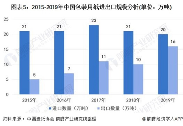 根據(jù)中國造紙協(xié)會資料,2015-2019年中國包裝用紙進口數(shù)量較為穩(wěn)定,保持在20-23萬噸之間,出口數(shù)量逐年上升,貿(mào)易逆差逐漸縮小,到2019年中國包裝用紙進口數(shù)量為20萬噸,出口規(guī)模為16萬噸。