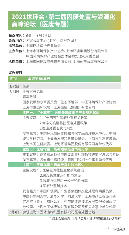為持續(xù)完善醫(yī)療廢物處置機(jī)制、守好“末端”防線,助力全國(guó)醫(yī)療廢物處置補(bǔ)短板能力建設(shè),提升醫(yī)廢收運(yùn)處置能力與水平,推進(jìn)《醫(yī)療廢物處理處置污染控制標(biāo)準(zhǔn)》的貫徹實(shí)施,2021年6月2日-3日將在上海舉辦“2021世環(huán)會(huì)·第二屆固廢處置與資源化高峰論壇(醫(yī)廢專題)”。