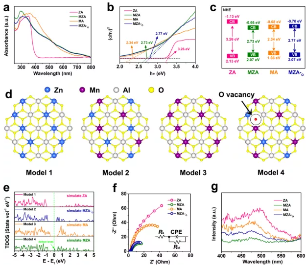 在本研究中,我們旨在揭示金屬取代效應增強LDH光催化性能的機理,特別是闡明錳取代和氧空位對提高MZA光催化活性的貢獻。紫外可見吸收光譜(圖2a)和帶隙寬度(圖2b)顯示與ZA和MA相比,MZA的帶隙更適合光催化反應。值得注意的是,MZA的帶隙比MZA-o略窄,這意味著帶隙的縮短不僅來自Mn取代,O空位在這個過程中也起到了一定的輔助作用。圖2c顯示了催化劑的能帶結(jié)構(gòu),觀察到MZA和MZA-o的價帶位置相近,而MZA的導帶低于MZA-o,說明氧空位對縮短帶隙的作用機制是降低導帶。在密度泛函理論計算中我們補充了模型4(圖2d),即具有一個氧空位的模型2(氧空位位置的選擇遵循最低總能量的原則),并計算了模型1-4的總態(tài)密度(TDOS)。如圖2e所示,模型的帶隙順序與圖2b中實驗確定的帶隙結(jié)果一致,其中模型2和模型4具有非常相似的能帶結(jié)構(gòu),兩者的區(qū)別在于模型4的能帶結(jié)構(gòu)中出現(xiàn)了一個明顯的中間能級,這表明O空位對縮短帶隙的貢獻是通過缺陷能級的形成來實現(xiàn)的。因此我們認為Mn取代和O空位的協(xié)同作用是帶隙縮短的原因,其中Mn取代的貢獻占主導地位,O空位的作用相對較弱。此外,催化劑的阻抗譜(圖2f)和穩(wěn)態(tài)熒光光譜(圖2g)的結(jié)果進一步證實了MZA的優(yōu)異光催化活性歸因于Mn取代和O空位,并且在提高載流子轉(zhuǎn)移能力方面,Mn取代的貢獻仍然大于O空位。