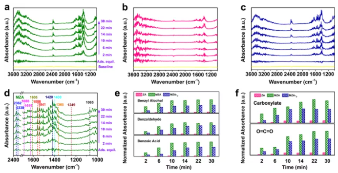 Fig. 4.In situ DRIFTS of the adsorption and removal process of toluene on (a) MZA, (b) ZA and (c) MZA-O; (d) Enlarged DRIFTS at the wavenumber range of 2400-2300 cm-1 and 1700-1000 cm-1 from Fig. 4a; (e) Species evolution of benzyl alcohol, benzaldehyde and benzoicacid; (f) carboxylate and CO2 during the reaction process.