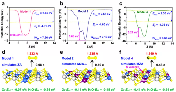 Fig. 3. Calculated electrostatic potential of (a) ZA, (b) MZA-O and (c) MZA (Evac represents vacuum level, EF means Fermi level and W is work function); Calculated O2 and H2O adsorption energy (Ead, negative means heat release), bader effective charge for the carried electrons of O2 (positive means electrons depletion) as well as O-O bond length of O2 molecule adsorbed on (d) Model 1, (e) Model 2 and (f) Model 4.