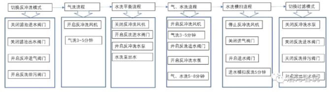 常規(guī)的濾池反沖洗是通過(guò)布置在濾料下方的反沖洗配氣配水廊道內(nèi)送入壓縮空氣和清水池的濾后水來(lái)進(jìn)行的,以采用彗星濾料的D型濾池來(lái)說(shuō),一般的流程是:1、切換反沖洗模式。2、氣洗流程。3、氣水洗流程。4、水洗加橫掃流程。5、切換過(guò)濾模式。詳細(xì)的操作流程見(jiàn)下圖。