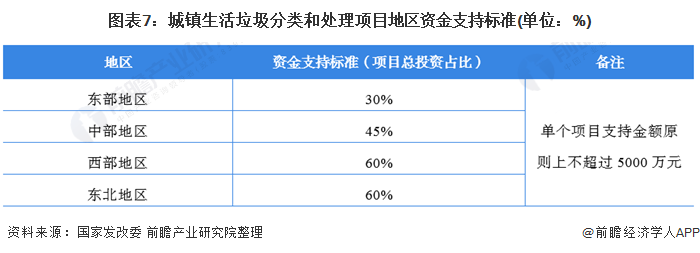 資金支持標(biāo)準(zhǔn)中有城鎮(zhèn)生活垃圾分類和處理項目,按東、中、西和東北地區(qū)分別不超過項目總投資的30%、45%、60%、60%控制,單個項目支持金額原則上不超過5000萬元,重大創(chuàng)新示范項目除外。