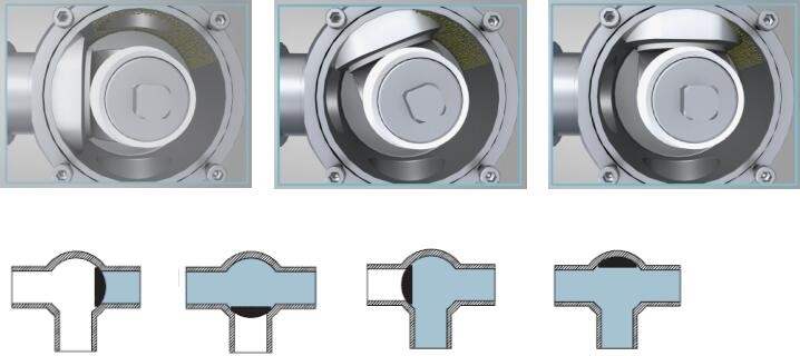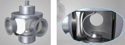 弧形閥可以實(shí)現(xiàn)流體的換向,相對(duì)于換向閥和三通球閥的優(yōu)點(diǎn)是易清洗,不會(huì)夾掛物料。