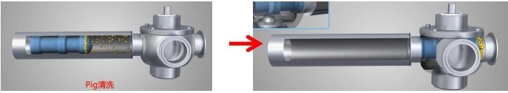 特殊的弧形閥芯設(shè)計(jì),可實(shí)現(xiàn)物料的在線Pig清洗回收。