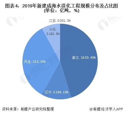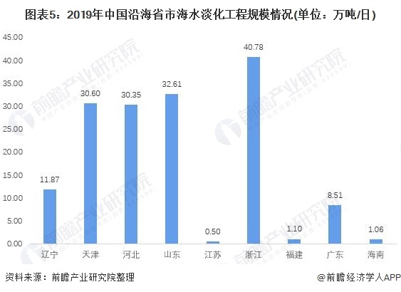 2019年我國新建海水淡化工程規(guī)模分布以華東地區(qū)、華北地區(qū)的沿海城市為主。其中浙江省海水淡化新建規(guī)模產(chǎn)能為18.03億噸,占我國海水淡化新建產(chǎn)能的45%,同時(shí)2019年浙江省海水淡化工程規(guī)模為40.78萬噸/日,是我國海水淡化行業(yè)發(fā)展最主要的城市。