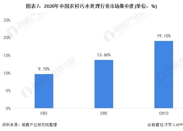 總體來(lái)看,我國(guó)農(nóng)村污水處理行業(yè)的市場(chǎng)集中度較低,2020年我國(guó)農(nóng)村污水處理行業(yè)CR3為9.7%;CR5為13.66%;CR10為19.10%。