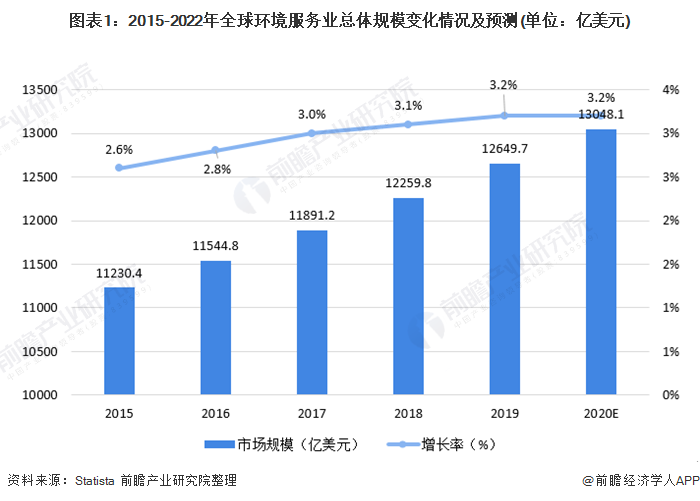 隨著環(huán)境保護和可持續(xù)發(fā)展理念的廣泛普及,世界環(huán)境服務業(yè)市場呈現(xiàn)迅速發(fā)展的勢頭,世界各國,特別是發(fā)達國家紛紛出臺相關政策并加大資金投入,加大對環(huán)保市場的扶持力度。2019年全球環(huán)境服務業(yè)市場規(guī)模達到12649.70億美元,同比增長3.20%,預估全球環(huán)境服務市場繼續(xù)保持穩(wěn)步發(fā)展態(tài)勢,2020年全球總規(guī)模達到13048.1億美元。