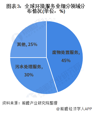 環(huán)境服務業(yè)各分項目發(fā)展很不平衡,廢物處置服務和污水處理服務占環(huán)境服務市場的主要份額。目前,這兩個項目產(chǎn)值占全球環(huán)境服務市場的75%,其中廢物處置服務占45%,污水處理服務占30%。