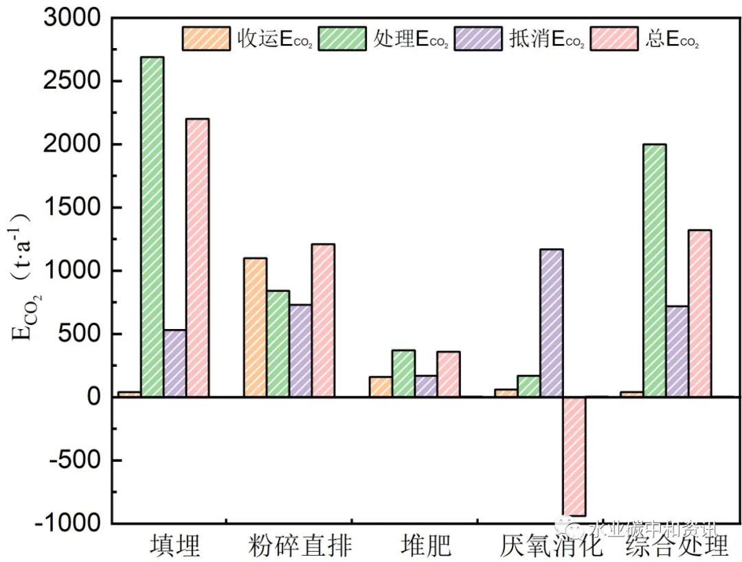 評估的LCA包括餐廚垃圾收集與運(yùn)輸、處理、產(chǎn)物各個(gè)處置環(huán)節(jié);LCA之碳排放涉及的溫室氣體包括CO2、N2O和CH4;N2O和CH4造成的溫室效應(yīng)分別乘以298、25折算為CO2當(dāng)量——ECO2。經(jīng)微生物分解代謝作用產(chǎn)生的CO2為生物成因(生源性),是有機(jī)物的自然歸宿,不列入碳排放計(jì)算;產(chǎn)生的CH4經(jīng)回收后用于發(fā)電或熱電聯(lián)產(chǎn)(CHP),這一途徑形成的碳排放不納入LCA碳排放匯總與計(jì)算。被回收的能源與資源可相應(yīng)地抵消碳排放量,主要包括由CH4用于發(fā)電或CHP后回收的電能或(和)熱能與可用作肥料的沼渣;產(chǎn)生的熱能除滿足自身升溫需求之外,未利用的剩余熱能不計(jì)入抵消ECO2項(xiàng)目內(nèi)。每kW·h電能可抵消0.608 kg ECO2,每kg肥料(以N計(jì))可抵消4 kg ECO2。據(jù)此計(jì)算各餐廚垃圾處置方式對應(yīng)的年ECO2數(shù)據(jù)(圖3)。