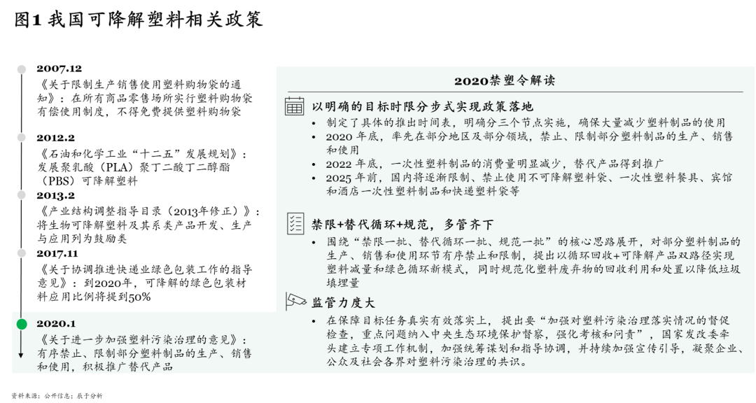 “白色污染是伴隨人類社會、經(jīng)濟(jì)發(fā)展過程中面臨的一個(gè)巨大挑戰(zhàn),21世紀(jì)以來,全球興起可降解風(fēng)潮,多個(gè)國家發(fā)布趨嚴(yán)政策推動行業(yè)發(fā)展。2020年1月,我國也正式從“限塑”轉(zhuǎn)為“禁塑”,繼而帶動可降解塑料行業(yè)從早期的低迷發(fā)展期進(jìn)入高速發(fā)展期。由于經(jīng)歷了長期的低迷發(fā)展,當(dāng)前行業(yè)競爭較為混亂且尚未定局,把握住核心要素便有可能成為龍頭企業(yè),領(lǐng)航黃金時(shí)代。 我國可降解塑料市場早在2012年就已經(jīng)起步,但由于早期市場需求低迷,原料成本過高、產(chǎn)能有限,行業(yè)整體發(fā)展緩慢,進(jìn)入市場較早的一些企業(yè)甚至因訂單長期不足而被迫轉(zhuǎn)型。直到2020年1月,《關(guān)于進(jìn)一步加強(qiáng)塑料污染治理的意見》(以下簡稱“禁塑令”)出臺,要求有序禁止、限制部分塑料制品的生產(chǎn)、銷售和使用,積極推廣替代產(chǎn)品,正式從“限塑”轉(zhuǎn)為“禁塑”(見圖1)。