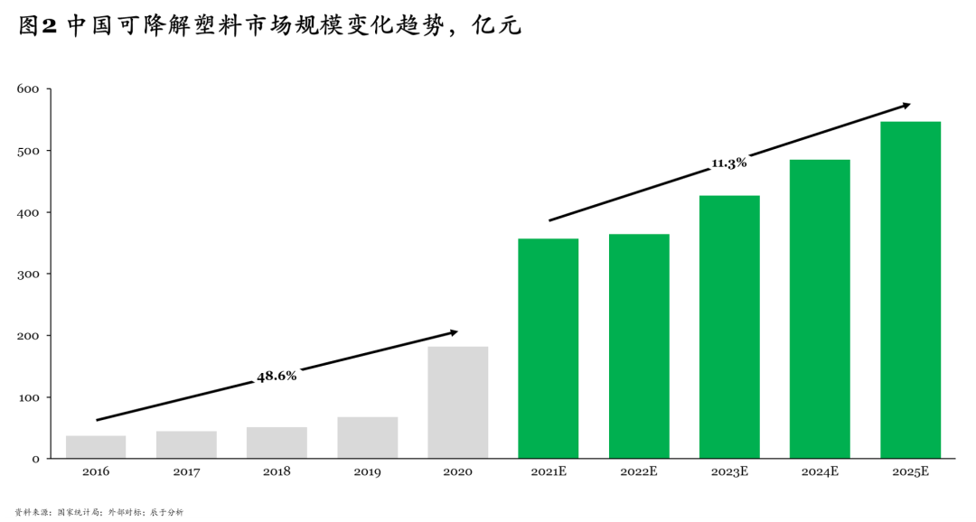 受此影響,作為傳統(tǒng)塑料替代產(chǎn)品的可降解塑料市場大幅度增長,訂單暴增,我們預(yù)計(jì)“十四五”期間,可降解塑料市場將以11.3%的年復(fù)合增速,到2025年實(shí)現(xiàn)500億元以上的收入規(guī)模(見圖2)。