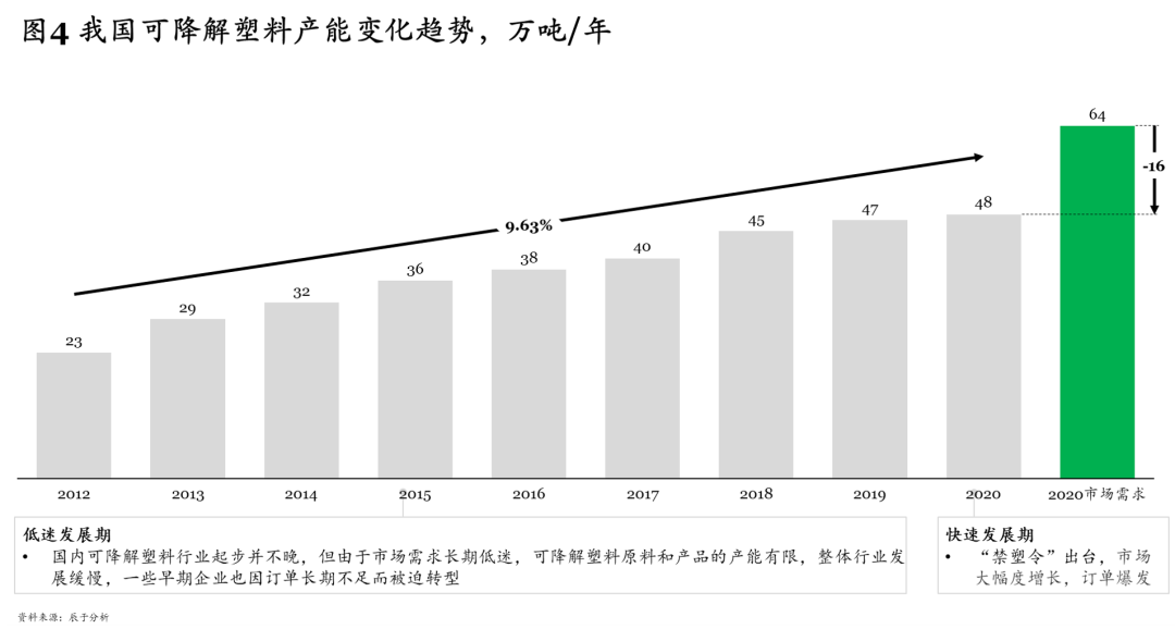 由于早前市場長期低迷,國內(nèi)可降解塑料的產(chǎn)能增速一直較慢,據(jù)統(tǒng)計(jì), 2012~2020年間,這一數(shù)字的年復(fù)合增長率為9.63%,到2020年達(dá)到48萬噸/年,同年的市場需求則為64萬噸/年,產(chǎn)能缺口較大(見圖4)。