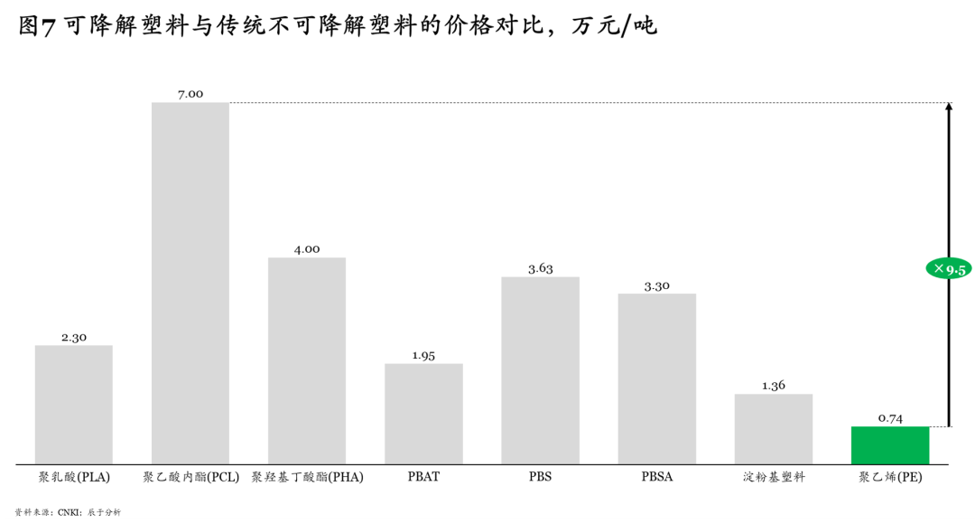 不可降解塑料如PP、PET、 PE等價(jià)格較低,可降解塑料價(jià)格明顯高于它們,目前主流可降解塑料如PLA、PHA、 PBAT的價(jià)格分別在1.6-3萬元/噸、4萬元/噸、1.4-2.5萬元/噸左右,是PE價(jià)格的2~5倍, 而PCL 的價(jià)格甚至高達(dá)7萬元/噸,是PE價(jià)格的9.5倍(見圖7)。