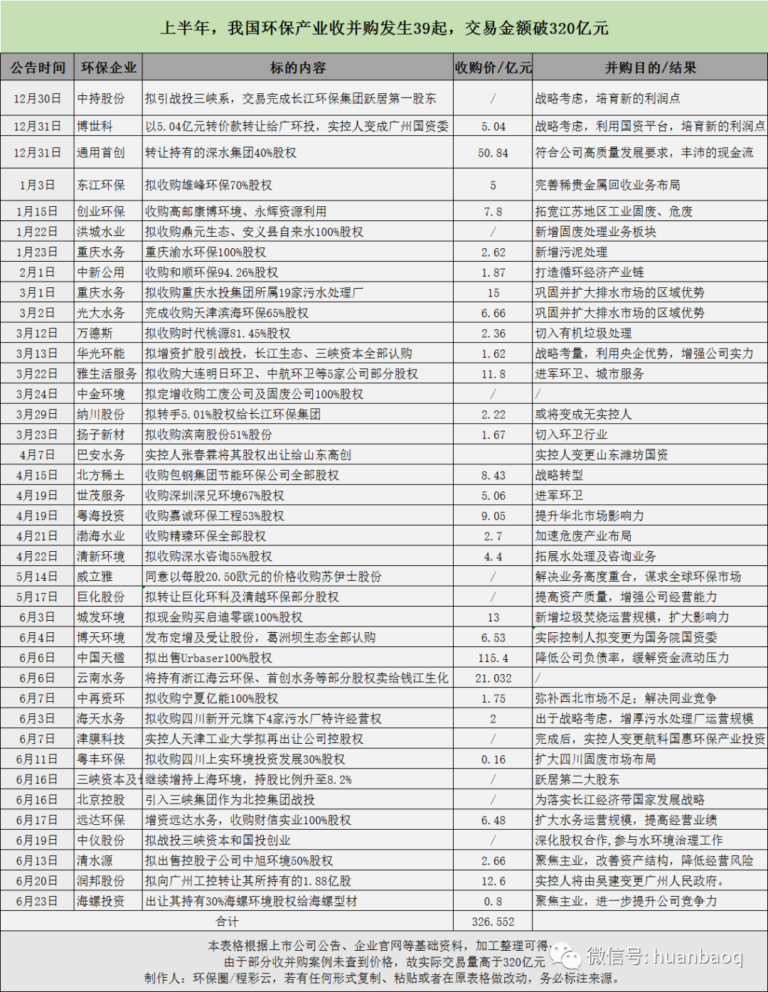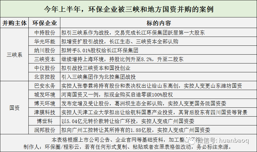 難道國資進(jìn)入,發(fā)生“混改”就一定會意味著原有民營企業(yè)經(jīng)營管理團(tuán)隊的重大調(diào)整,意味著新的企業(yè)會遭遇對國企嚴(yán)格管理制度的不適應(yīng),進(jìn)而導(dǎo)致企業(yè)喪失市場活力么?現(xiàn)在看來,中持股份與長江生態(tài)環(huán)保集團(tuán)的“無實控人”混改模式有可能給出不一樣的答案。但至于哪種模式更科學(xué),效果更好,目前還難以回答,為時尚早?;蛟S再過3年5年,時間會給出答案。遙想6年前,那時的環(huán)保行業(yè)非常熱鬧,不僅惹得圈內(nèi)環(huán)保企業(yè)一路“買買買”向構(gòu)建大環(huán)保平臺邁進(jìn),更有諸多圈外非環(huán)保企業(yè)跨界而來,被媒體戲稱為“野蠻人入侵”。2015年,是傳統(tǒng)行業(yè)跨界環(huán)保的元年,在看到環(huán)境產(chǎn)業(yè)成長紅利后,他們紛紛大手筆跨界,落子環(huán)境產(chǎn)業(yè)。據(jù)媒體不完全統(tǒng)計,當(dāng)年環(huán)保領(lǐng)域至少新添了40張新面孔,其中不乏葛洲壩集團(tuán)、中國石化、中信集團(tuán)、中國中車、中國中鐵這樣的大型國企。2016年則是跨界布局環(huán)境產(chǎn)業(yè)的爆發(fā)期,在這一年間,許多實力強勁的企業(yè)紛紛跨界環(huán)保,業(yè)內(nèi)一片嘩然,有人認(rèn)為他們進(jìn)入是好事,給環(huán)保行業(yè)帶來大量資金,也有人認(rèn)為他們會進(jìn)一步擠壓環(huán)保企業(yè)利潤,未來廝殺會越演愈烈。還有人認(rèn)為,入場者眾,出局者亦增多,未來五年才是環(huán)保并購的驗證期,那些盲目入場、沒有技術(shù)和資本能力的企業(yè)將在“大洗牌”中出局。到了2018年,跨界環(huán)境產(chǎn)業(yè)的并購僅有6起,外界資本對環(huán)境投資愈發(fā)理性和謹(jǐn)慎,絕大多數(shù)并購都是環(huán)保同行之間的兼并,橫向產(chǎn)業(yè)鏈下上游并購多發(fā)。從標(biāo)的來看,相對2015年水務(wù)和流域治理,2018年危廢和環(huán)衛(wèi)則成為資本爭寵的標(biāo)的。到了今年上半年,在39起并購案例中,真正意義上的跨界并購僅有3起,一個是從事稀土深加工的內(nèi)蒙企業(yè)北方稀土以8.43億元價格,收購了包鋼集團(tuán)旗下的節(jié)能環(huán)保公司全部股權(quán),謀求轉(zhuǎn)型;另一個是生產(chǎn)建筑板材企業(yè)揚子新材以自有資金收購濱南股權(quán)51%股份,切入環(huán)衛(wèi),瞄準(zhǔn)城市公共服務(wù)。還有一個,就是開篇提到的主業(yè)做生物殺蟲劑的錢江生化,并購云南水務(wù)旗下的污水處理廠運營權(quán)。隨著外界資本跨界環(huán)保熱情減退,近兩年海外并購也在逐年降溫,降至冰點以下。前幾年,在國家“一帶一路”戰(zhàn)略下,環(huán)保頭部企業(yè)為了快速補齊技術(shù)、服務(wù)運營的短板,曾經(jīng)掀起一個出?!疤越稹钡臒岢?。北控、首創(chuàng)、中國天楹、錦江環(huán)境、云南水務(wù)、國禎環(huán)保、永清環(huán)保、格林美等優(yōu)秀環(huán)保上市企業(yè),都曾出于各種戰(zhàn)略考慮,尋求海外并購。其中北控曾在2016年斥資14.38億歐元(約125.48億港元),收購德國最大垃圾發(fā)電EEW全部股權(quán),成為中國對德最大并購交易。然而近兩年來,國內(nèi)環(huán)保龍頭企業(yè)則鮮有海外并購,即使有,也沒能掀起太大的浪花。據(jù)筆者觀察,今年上半年39起并購案例中,竟然沒有一例是龍頭環(huán)保企業(yè)出海并購國際友商,反倒是中國天楹拋售海外資產(chǎn),兩大法企威立雅和蘇伊士合并。從并購就能看出,兜兜轉(zhuǎn)轉(zhuǎn)不過幾年間,環(huán)保行業(yè)就已經(jīng)走了一波人,來了一撥人。行業(yè)格局正在發(fā)生巨變,一個新的時代已經(jīng)拉開大幕。附:上半年我國環(huán)保行業(yè)收并購案例詳情: