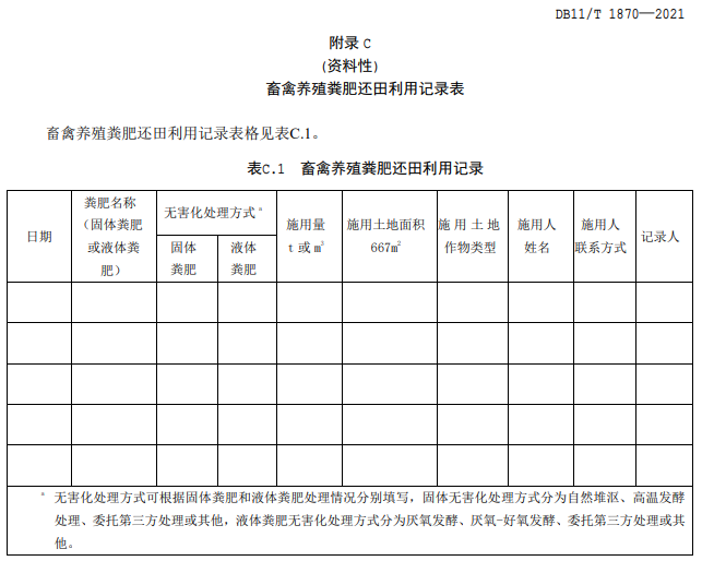 9.1 建立畜禽養(yǎng)殖糞肥還田利用臺賬記錄,記錄信息應包括無害化處理情況、施用量、施用時間、施用方式、施用土地面積與施用者等內容。臺賬記錄表格式見附錄 C。