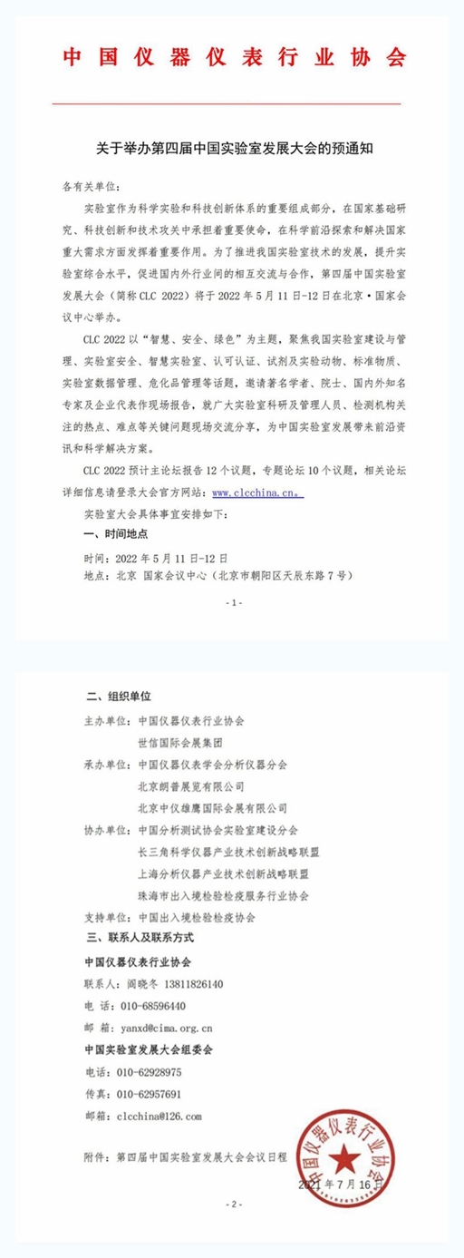 第四屆中國實驗室發(fā)展大會(以下簡稱CLC 2022)將于2022年5月11日-12日在北京·國家會議中心舉辦,現(xiàn)誠摯邀請有關(guān)單位和相關(guān)工作者及社會各界代表踴躍參加本次大會,共同推動我國實驗室的技術(shù)創(chuàng)新和高水平發(fā)展。