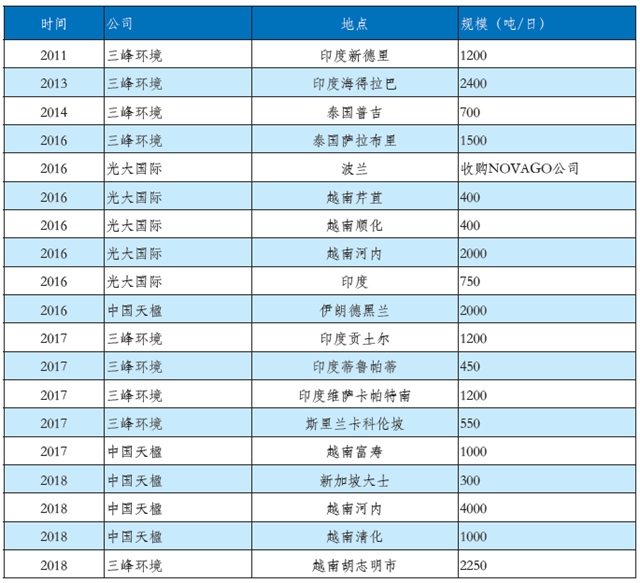 在固廢領(lǐng)域,具備自主設(shè)備制造能力的三峰環(huán)境、光大國際、中國天楹等企業(yè)也已經(jīng)成功邁出國際化的堅(jiān)實(shí)一步。以三峰環(huán)境為例,2013年投資并運(yùn)營多座生活垃圾填埋場、危險廢物處理廠、垃圾資源化回收利用廠以及生活垃圾發(fā)電廠。同年,隆企集團(tuán)贏得印度首批垃圾發(fā)電項(xiàng)目,確定與三峰環(huán)境合作,并采用三峰環(huán)境提供的設(shè)備和技術(shù)方案。目前三峰環(huán)境的技術(shù)設(shè)備已應(yīng)用到美國、印度、埃塞俄比亞、泰國、斯里蘭卡、越南、巴西等七個國家的垃圾焚燒發(fā)電項(xiàng)目。