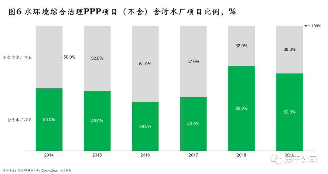 此外,我們也看到,越來(lái)越多的單一污水項(xiàng)目逐漸融入到水環(huán)境綜合治理及長(zhǎng)江、黃河的流域保護(hù)治理中,尤其是2017年P(guān)PP清庫(kù)開(kāi)始后,含有污水廠建設(shè)運(yùn)營(yíng)的水環(huán)境綜合治理項(xiàng)目占比明顯增加,相比2017年之前的不到50%,2018、2019連續(xù)兩年這一比重都超過(guò)60%(見(jiàn)圖6)。