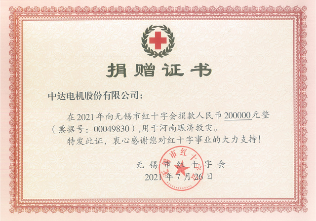 近日,河南暴雨成災(zāi),特別是鄭州、新鄉(xiāng)等地受災(zāi)嚴(yán)重,牽動著全國人民的心。中達電機股份有限公司一直心系救援情況和受災(zāi)群眾,通過無錫紅十字會向河南捐款人民幣200000元整,用于物資采購及災(zāi)后重建工作。中達電機股份有限公司愿災(zāi)區(qū)群眾能夠早日恢復(fù)正常生活,并向所有奮戰(zhàn)在一線搶險救援的工作人員和組織機構(gòu)致以最崇高的敬意!