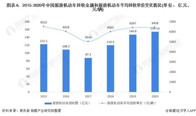 根據(jù)商務(wù)部發(fā)布的《中國再生資源回收行業(yè)發(fā)展報告(2020)》公布的數(shù)據(jù)顯示,預(yù)計(jì)2020年報廢機(jī)動車市場將呈現(xiàn)持續(xù)較快增長的良好態(tài)勢,增幅將在5%左右。通過每年商務(wù)部報告統(tǒng)計(jì)數(shù)據(jù)顯示,我國報廢機(jī)動車回收額2017年之后呈現(xiàn)較好的增長態(tài)勢,報廢機(jī)動車平均回收單價也呈現(xiàn)上升趨勢。2020年我國報廢機(jī)動車總額為154.14億元,每輛機(jī)動車平均處理單價為6428元。