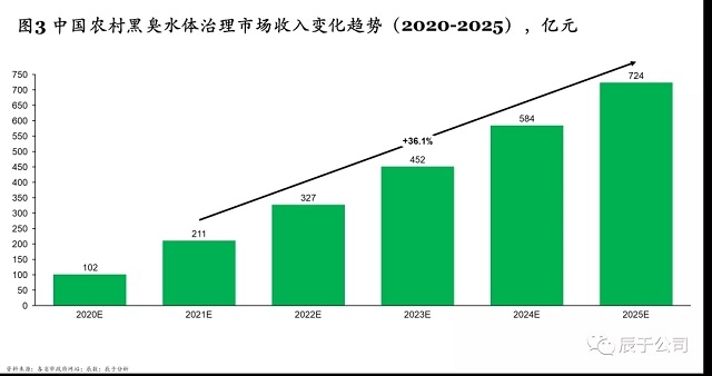 我國黑臭水體治理起步于2015年,政策加碼之下,城市黑臭水體治理“十三五”期間取得明顯成效,累計(jì)完成城市黑臭水體治理2862條,消除率98.2%,現(xiàn)已進(jìn)入尾聲。展望“十四五”,我國黑臭水體治理的主戰(zhàn)場(chǎng)將逐步轉(zhuǎn)向農(nóng)村,預(yù)計(jì)未來五年這一市場(chǎng)將保持36.1%的年復(fù)合增長(zhǎng),到2025年達(dá)到724億元的收入規(guī)模。