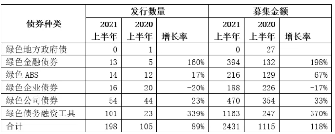 2021年上半年國內(nèi)貼標綠色債券市場整體上行,新增發(fā)行綠色貼標債券198只,發(fā)行規(guī)模約2431億元,規(guī)模同比增長118%;占債券市場新發(fā)債券總額的1.33%,同比增長113.43%。從新增發(fā)行只數(shù)和規(guī)模增幅看,綠色債務融資工具、綠色金融債市場逐漸擴大,其中綠色債務融資工具新增發(fā)行101只,規(guī)模約1163億元,規(guī)模同比增長370%;綠色金融債新增發(fā)行13只,規(guī)模約394億元,規(guī)模同比增長198%;綠色ABS新增發(fā)行14只,規(guī)模約216億元,規(guī)模同比增長67%;綠色公司債券新增發(fā)行54只,發(fā)行規(guī)模約470億元,規(guī)模同比增長23%。此外,綠色企業(yè)債券市場相對滯緩,新增發(fā)行16只,發(fā)行規(guī)模約188億元,規(guī)模同比下降17%。