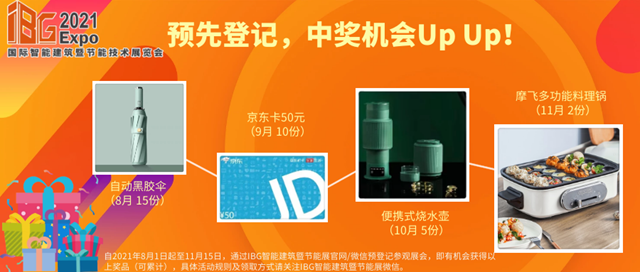 據(jù)悉,“IBG國際智能建筑暨節(jié)能技術(shù)展覽會(huì)”觀眾預(yù)登記已開啟,自8月開始至11月預(yù)登記的觀眾有機(jī)會(huì)享自動(dòng)黑膠傘、京東卡、便攜式燒水壺、摩飛多功能料理鍋等實(shí)用好禮!活動(dòng)獎(jiǎng)品可累計(jì),越早登記中獎(jiǎng)機(jī)會(huì)越多。主辦方期待于2021年11月30日-12月2日與更多業(yè)內(nèi)人士相聚上海新國際博覽中心,共筑智能建筑生態(tài)圈!