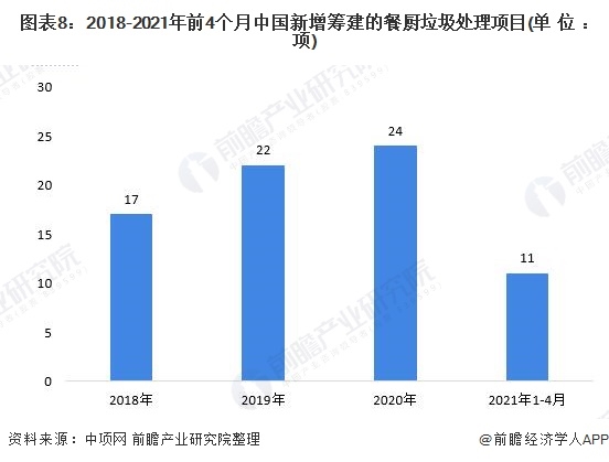 由于2020年疫情的特殊情況,僅比較2019年和2021年的情況來看,2021年1-4月,我國(guó)新增籌建的餐廚垃圾處理項(xiàng)目已經(jīng)有11項(xiàng),相當(dāng)于已達(dá)到2019年新增籌建項(xiàng)目的50%。