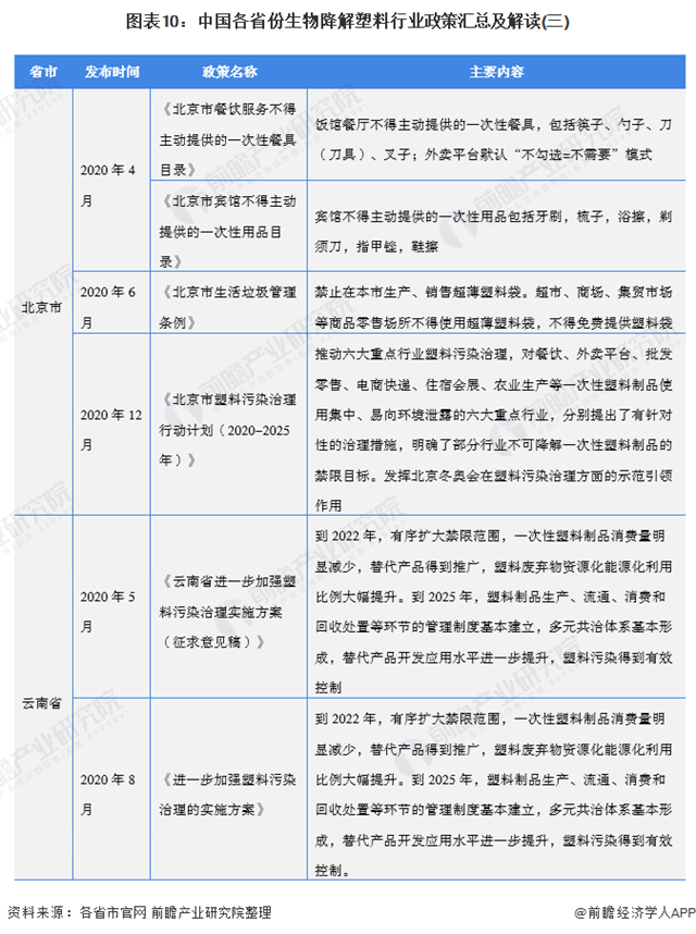 與國(guó)家層面政策一致,省市層面也暫未出臺(tái)對(duì)生物降解塑料行業(yè)的發(fā)展目標(biāo)(直接關(guān)聯(lián)),但由于生物降解塑料的市場(chǎng)發(fā)展主要由“限塑令”和“禁塑令”驅(qū)動(dòng),匯總?cè)缦???梢钥闯?,我?guó)大部分省市均提出了到2025年塑料制品管理制度基本建立,多元共治體系基本形成,同時(shí)替代產(chǎn)品開發(fā)應(yīng)用水平進(jìn)一步提升,其中部分省市也將這一發(fā)展目標(biāo)提前至2022年、2023年,例如北京市、浙江省。