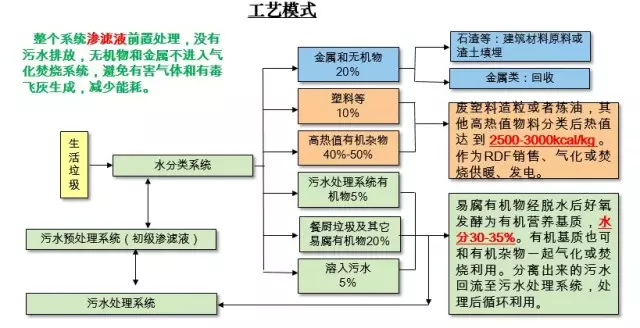 以自有研發(fā)的垃圾水分類技術(shù)為核心和前提,結(jié)合并優(yōu)化現(xiàn)有垃圾分類方法、資源再生技術(shù)的垃圾處理方法,整個系統(tǒng)滲濾液前置處理,沒有污水排放,無機物和金屬不進(jìn)入氣化焚燒系統(tǒng),避免有害氣體和有毒飛灰生成,減少能耗。以其恩施項目為典型案例,對其具有自主專利的垃圾水分類技術(shù)進(jìn)行了全面的介紹,具有綜合利用率80%以上,無二次污染,清洗水全部經(jīng)處理回用,氣化燃?xì)夂蜔煔馀欧胚_(dá)標(biāo)無隱患等技術(shù)特點。