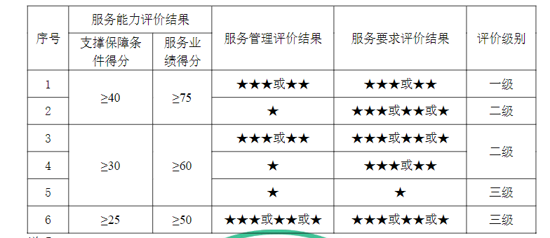 說明:1.支撐保障條件得分≥40,且服務(wù)業(yè)績(jī)得分≥75,只要服務(wù)管理評(píng)價(jià)結(jié)果或服務(wù)要求評(píng)價(jià)結(jié)果被評(píng)為★,則評(píng)價(jià)級(jí)別為二級(jí)。2.支撐保障條件得分≥30,且服務(wù)業(yè)績(jī)得分≥60,只要服務(wù)管理評(píng)價(jià)結(jié)果和服務(wù)要求評(píng)價(jià)結(jié)果同時(shí)被評(píng)為★,則評(píng)價(jià)級(jí)別為三級(jí)。