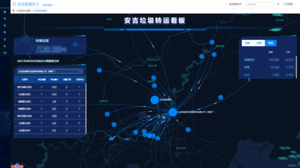 數(shù)據(jù)駕駛艙一圖統(tǒng)管:運用“一張圖”管理概念,安吉垃圾分類工作推進情況、垃圾分類覆蓋情況、業(yè)務監(jiān)管關鍵指標數(shù)據(jù)、督查考核關鍵數(shù)據(jù)、各類垃圾收運處情況和趨勢等垃圾分類數(shù)據(jù)在駕駛艙內綜合直觀展示,同時實現(xiàn)監(jiān)管數(shù)據(jù)之間的聯(lián)動,可全局把控整體業(yè)務。