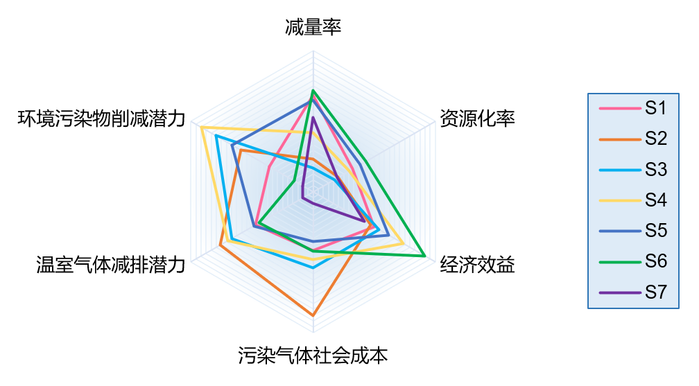 通過綜合考慮多項指標,可以得到各項技術(shù)的指標表現(xiàn)雷達圖,同時也可以看出各指標下不同處理技術(shù)的表現(xiàn)排名。