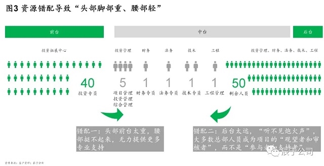 不難發(fā)現(xiàn),近年來(lái)一些企業(yè)開始“招兵買馬”,大量招聘投資拓展人員,這對(duì)于企業(yè)提高投資拓展能力自然是好事。不過(guò)我們也注意到,一些企業(yè)在投資相關(guān)的人員配置上卻不盡合理:他們通常把大量投資拓展人員“撒在前線”,同時(shí)建立“大后臺(tái)”,與投資相關(guān)的投管、財(cái)務(wù)、法務(wù),甚至技術(shù)、工程、運(yùn)營(yíng)等人員主要負(fù)責(zé)項(xiàng)目質(zhì)量把關(guān)和風(fēng)險(xiǎn)管控,只有少量人員在中臺(tái)為前臺(tái)提供支持。這種“頭重腳重”帶來(lái)兩個(gè)“錯(cuò)配”,一是頭部前臺(tái)太重,腰部挺不起來(lái),無(wú)力提供更多專業(yè)支持;二是腳部后臺(tái)太遠(yuǎn),“聽不見炮火聲”,大多數(shù)人成為項(xiàng)目的“觀望者和審核者”,而不是“參與者和支持者”。