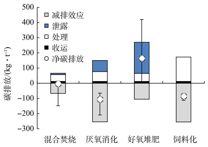 在廚余垃圾處理過程中,附加碳排放一般不到 50 kg·t?1,收運(yùn)過程的碳排放也相對(duì)較小,因此系統(tǒng)熱效率、有機(jī)質(zhì)降解率和溫室氣體泄漏率是影響不同處理模式碳排放的主要因素。飼料化和厭氧消化具有最好的碳減排效應(yīng),而混合焚燒的碳減排效應(yīng)可忽略不計(jì)。好氧堆肥受到溫室氣體泄漏的影響,會(huì)產(chǎn)生較多的碳排放,當(dāng)堆肥工藝運(yùn)行良好,無 CH4 和 N2O 排放時(shí),好氧堆肥可產(chǎn)生碳減排效應(yīng)。